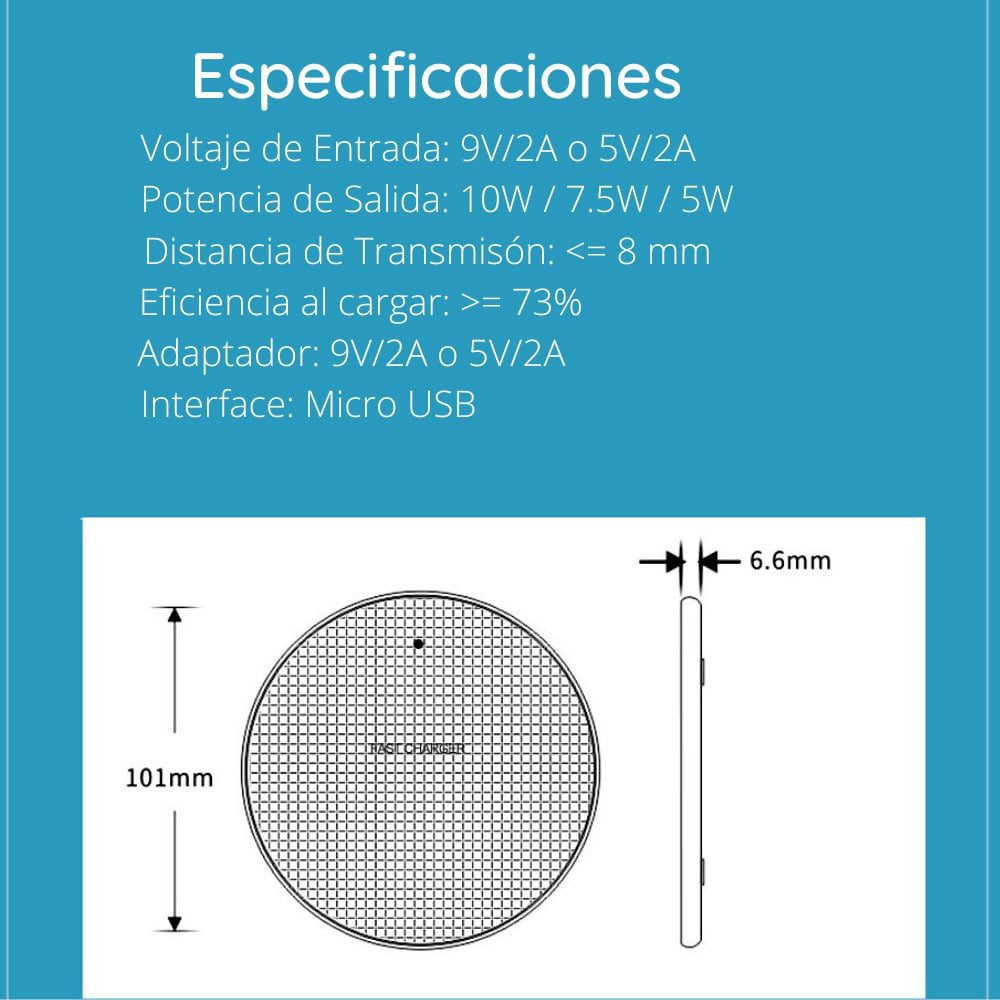 Distancia de Transmisión: <= 8mm Eficiencia al Cargar: >= a 73%